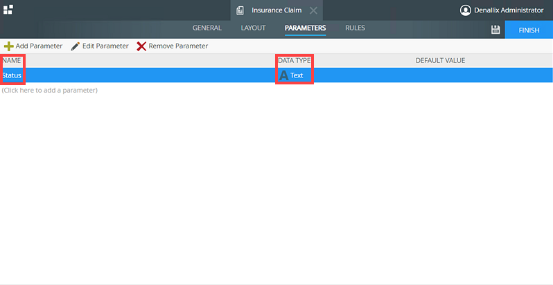 - More rules are required but you will configure them once the you have created the Insurance Claim Approval workflow. Now you must configure a form parameter which is used when the claim is actioned with either the Approve or Decline buttons.