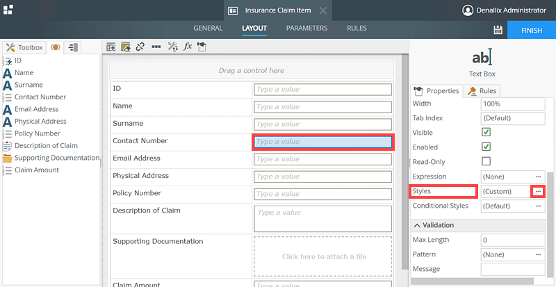- Select the Contact Number text box and click the Styles ellipsis ....