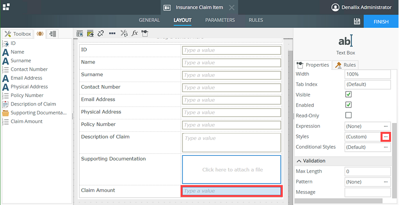 - Select the Claim Amount text box and click the Stylesellipsis ....