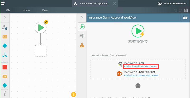 - Notice that the start event which you configured in the Insurance Claim Approval Workflow is added to the rule.