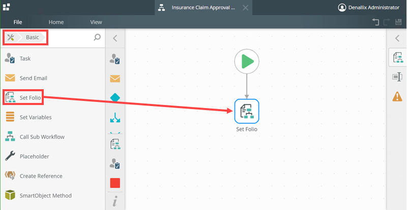 - Drag a Set Folio step from the Basic section of the Toolbox onto the canvas.