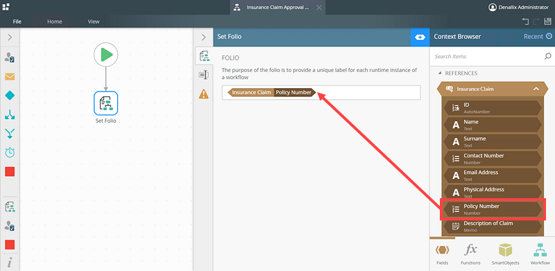 - Expand the Insurance Claim reference and drag the Policy Number reference to the Set Folio page.