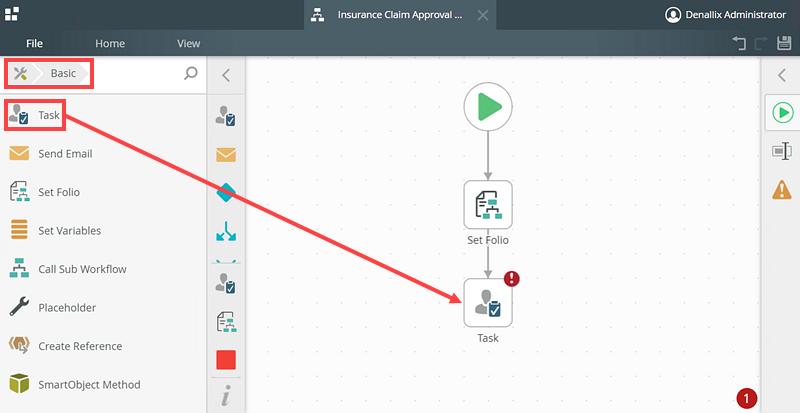 - Drag a Task step from the Basic section of the Toolbox onto the canvas.