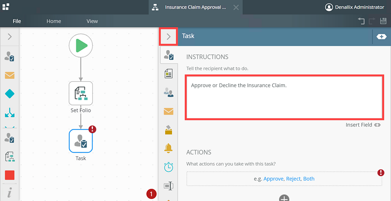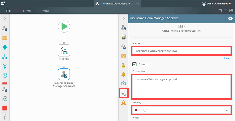 - On the Task page, click the Properties tab and rename the task name to Insurance Claim Manager Approval. Add the following to the Description: Insurance Claim Manager Approval. Set the task Priority to High.