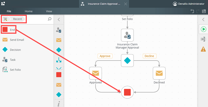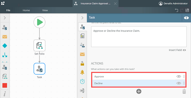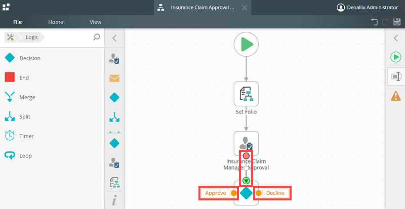- Connect the Insurance Claim Manager Approval step to the Decision step. Notice that the actions are generated on the canvas.