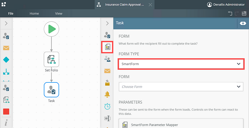 - Click the Form option on the Task step. On the Form Type section, select SmartForm.