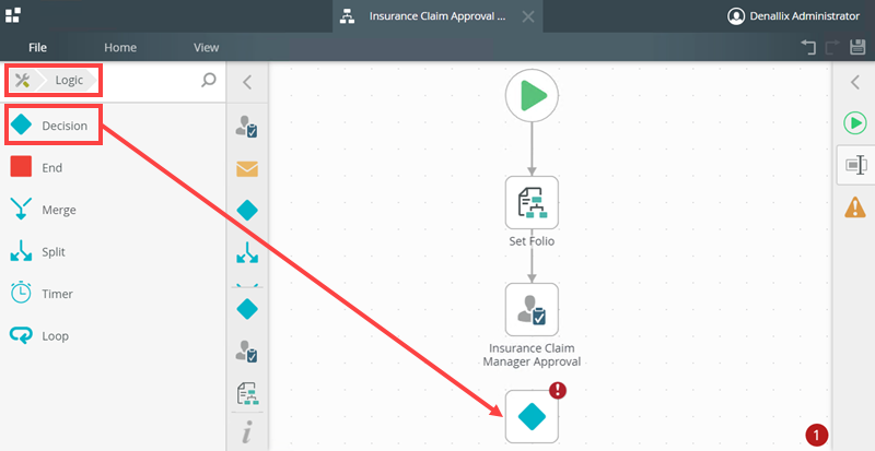 - Drag a Decision step from the Logic section of the Toolbox onto the canvas.