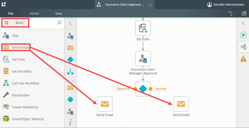 - Drag two Send Email steps from the Basic section of the Toolbox onto the canvas.