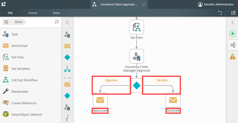 - Disable the then hide Approve Form control and then hide Decline Form control actions. When Bob opens the worklist item he should see the Approve and Decline buttons so he can decide whether to approve or decline the insurance claim.