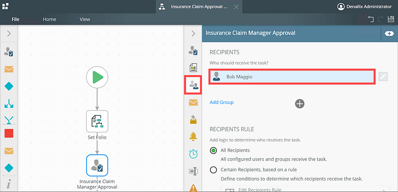 - On the Task page, click the Recipients tab. Remove the Originator option on the Who should receive the task? section and add Bob as the recipient.