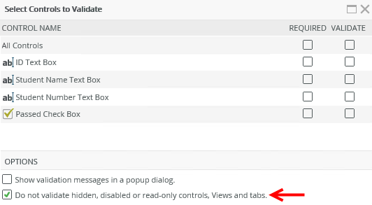 The option to not validate hidden, disabled or read-only controls, views and tabs also applies to controls and views that are dynamically changed to disabled or read-only in runtime. For example if a control is enabled and is subsequently changed in runtime to disabled, this option applies to that control if the validation is done after the control is changed to disabled.