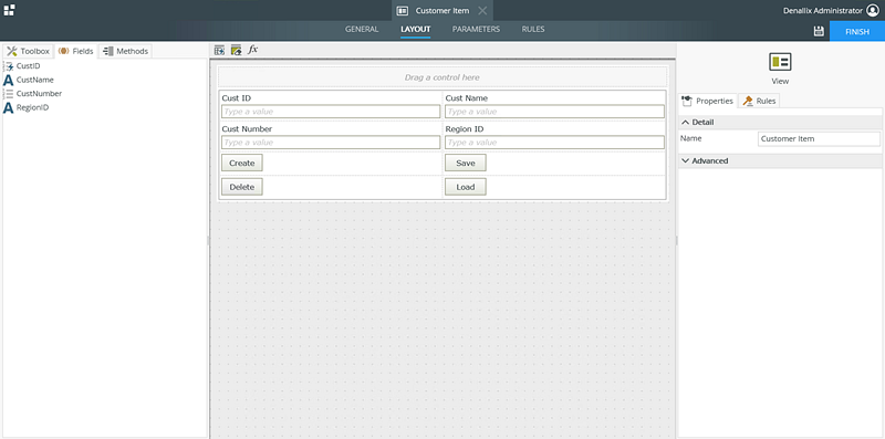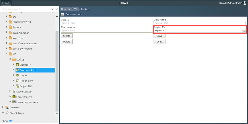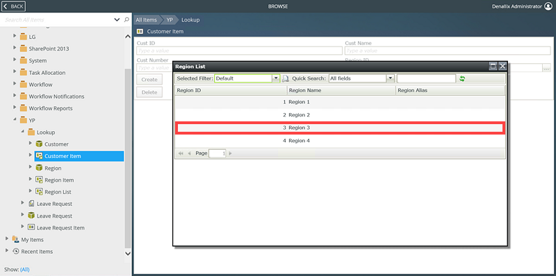 Customer SmartObject Property Type Key Required Unique CustID Autonumber Yes No Yes CustName Text No No No CustNumber Number No No No RegionID Text No No No Region SmartObject Property Type Key Required Unique RegionID Autonumber Yes No Yes RegionName Text No No No RegionAlias Text No No No - Generate an Item View for the Customer SmartObject and a List View for the Region SmartObject.