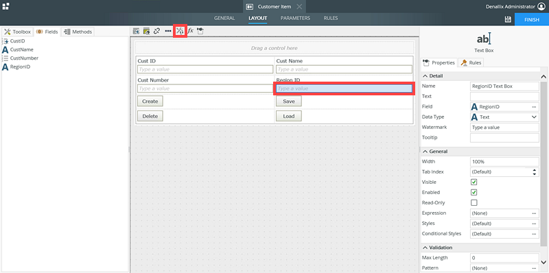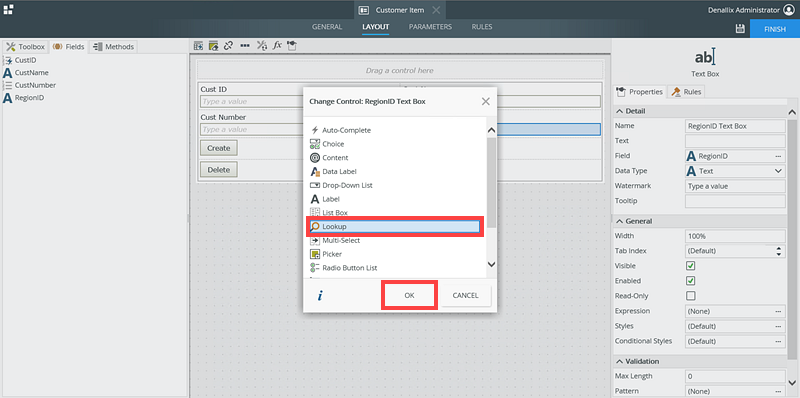 - Edit the Customer Item View, select the Region ID field, and then click the Change Control icon.