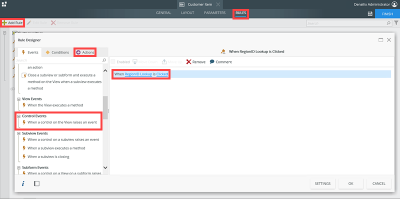 Navigate to the Rules tab of the step and click Add Rule. Select When a control on the View raises an event. Select the RegionID Lookup control and select Clicked. Click the Actions tab at the top.
