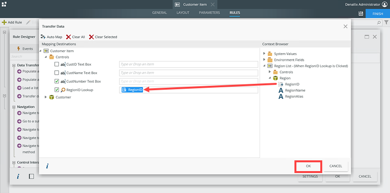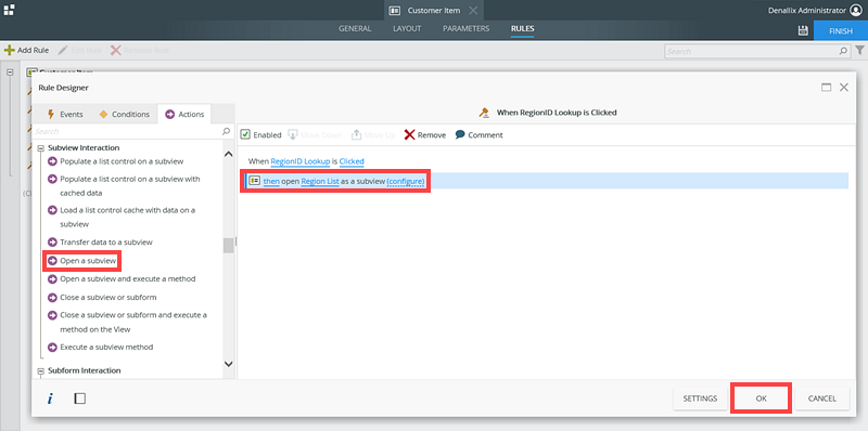 Select Open a subview located in the Subview Interaction section. Select the Region List view. This rule opens the Region List view in a subview when the RegionID lookup control is clicked. Click OK.