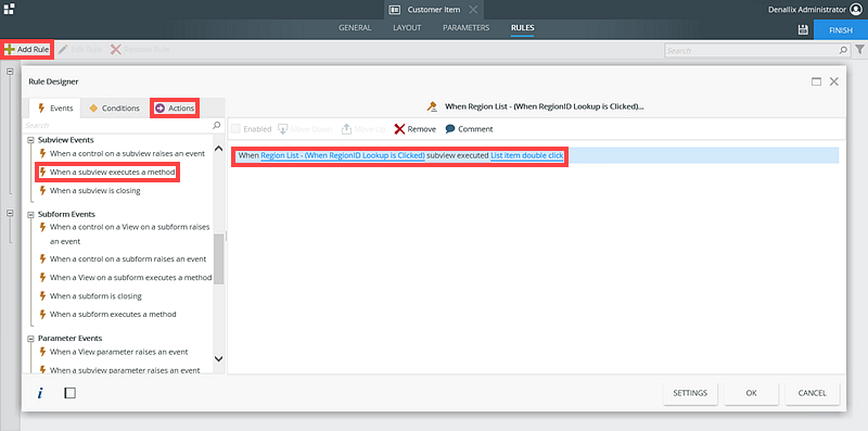 - Click Add Rule again. Under Events, in the Subview Events section, select When a subview executes a method. Select the Region List subview and List item double click as the method. Click the Actions tab.