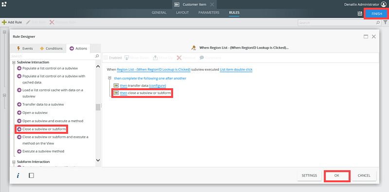 - Select Close a subview or subform under the Subview Interaction section. Click OK and Finish to save the view. This rule transfers data from the Region List subview to the Customer View when an item is double clicked on the subview. The Region List subform then closes.