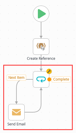 - The Loop step generates two outcomes: Next Item and Complete. The workflow loops through steps connected to the Next Item outcome until it reaches the end of the referenced list. At that point, it follows the Complete outcome. Connect the Next Item outcome to the Send Email step. Connect the Send Email step back to the Loop step.