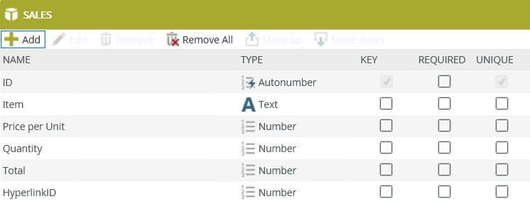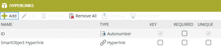 Hyperlinks SmartObject Type Key Required Unique ID Autonumber Yes No Yes Item Text No No No Price per Unit Number No No No Quantity Number No No No Total Number No No No HyperlinkID Number No No No
