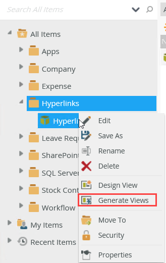 - From the category tree, right click the Hyperlinks SmartObject and click Generate Views.