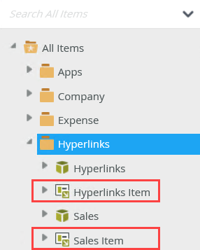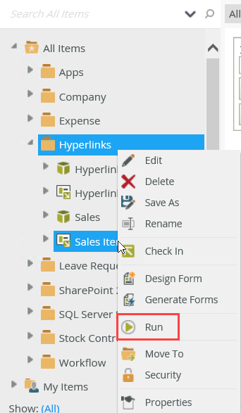 - Use the same steps to generate an Item view for the Sales SmartObject. The views show in the Hyperlinks category.
