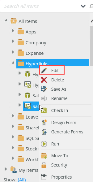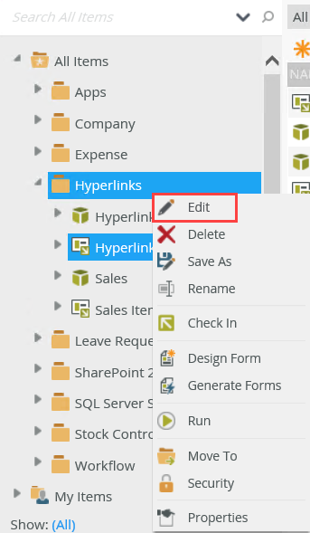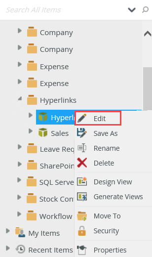 - From the K2 Designer, right-click the Hyperlinks Item view and select Edit.