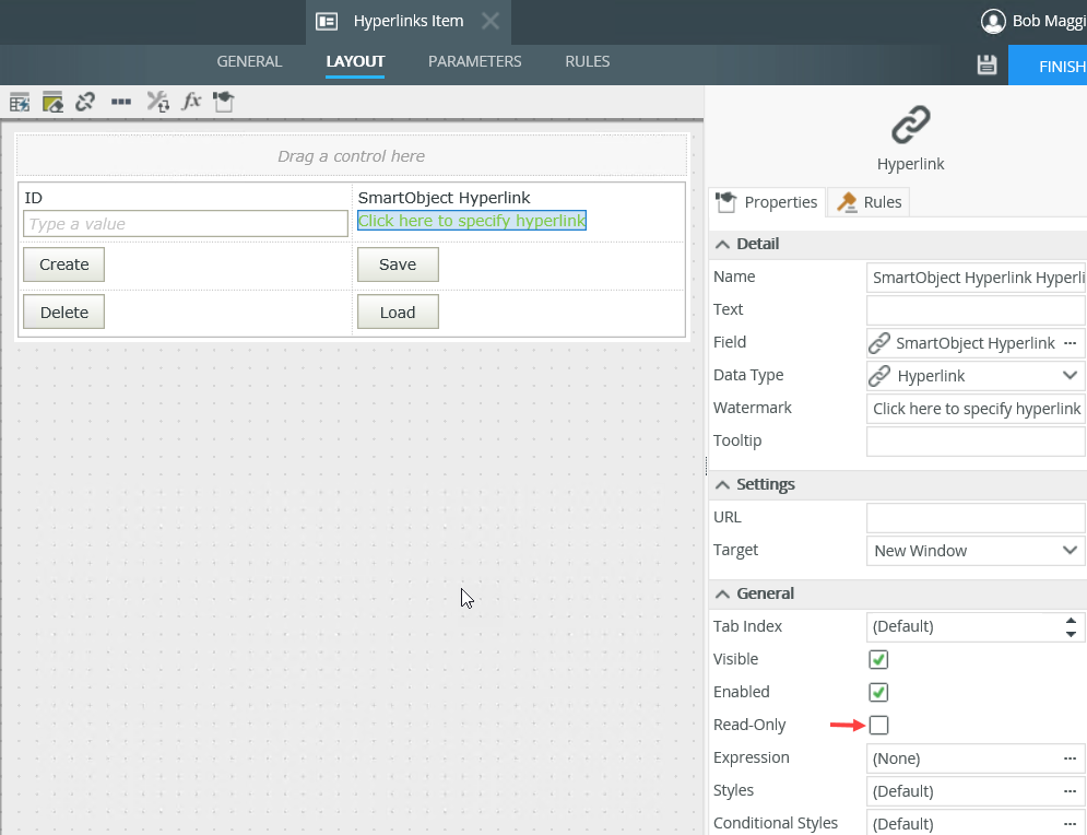 - On the Layout tab, click the hyperlink control of the SmartObject Hyperlink and untick the Read-Only property.