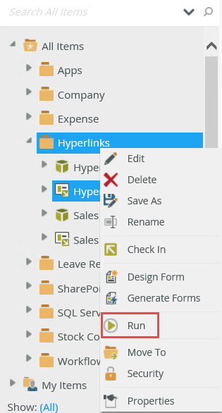 - From the K2 Designer, locate the Hyperlinks Item view and click Run.