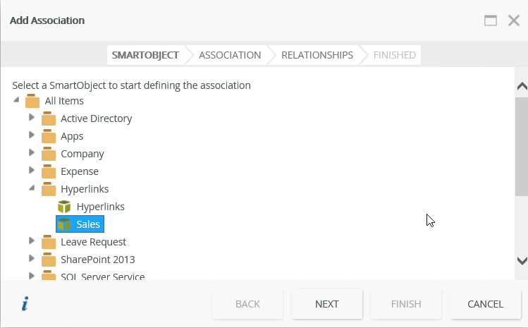 - On the SmartObject tab of the wizard click Add, select the Sales SmartObject from the Hyperlinks category, then click Next.