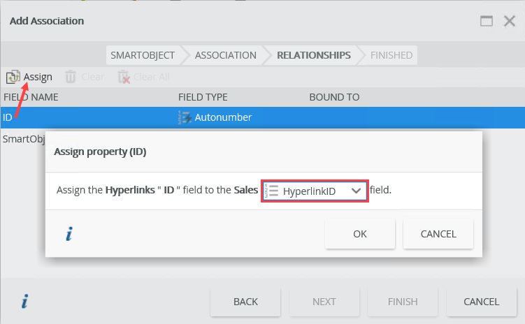 - On the Relationships tab of the wizard select the ID field and click Assign. Select the HyperlinkID field in the Assign property dialog. Click OK and then Finish.