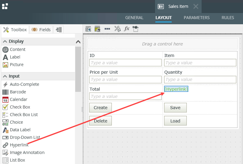 - On the Layout tab, drag the Hyperlink control onto the canvas.