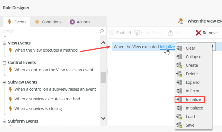 - On the Events tab, select When the View executes a method and then select Initialize.