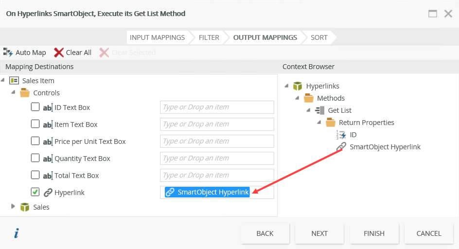 - Drag the SmartObject Hyperlink from the Return Properties into the Hyperlink control. Click Finish and OK.