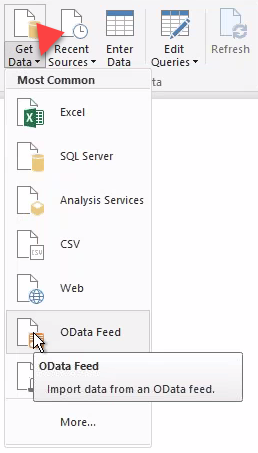 - Click on the Get Data Down Arrow and select OData Feed from the menu.