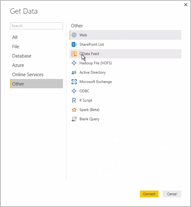- Access to the OData Feed configuration can also be found by clicking on the Get Data icon and using the Search option, or navigating to Other.