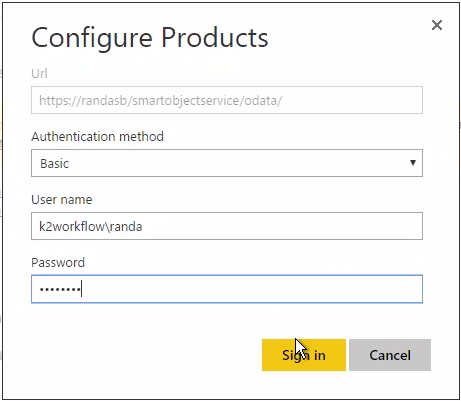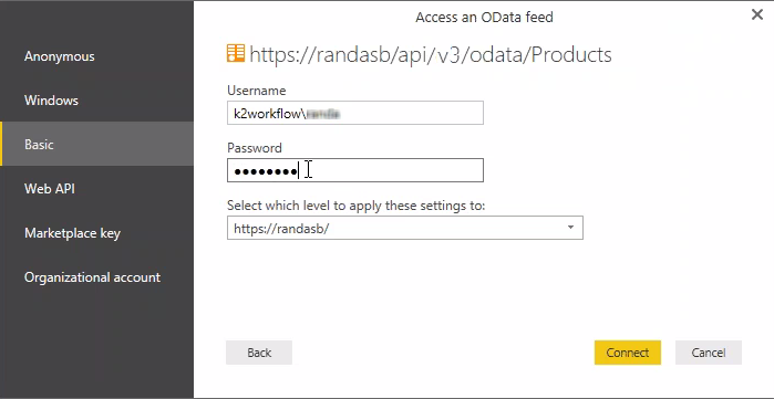 You can pre-select a SmartObject in the OData feed by adding the name of that SmartObject to the end of the OData URL. For example: https://k2.denallix.com/api/odata/v3/MYSMARTOBJECTNAME - Select Basic authentication in the Access to OData feed page, then add your Username and Password.