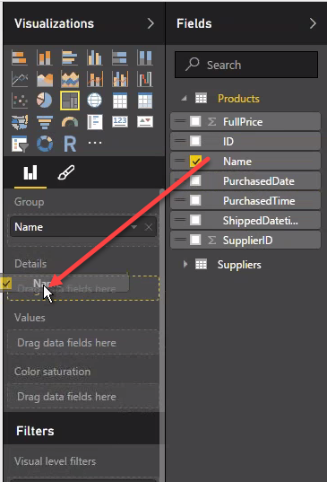 - The SmartObject data shows in the Fields column. Select a visualization and configure it by dropping fields from the SmartObject. Now that the data is available in Power BI, you can use standard Power BI features to design and build your reports.