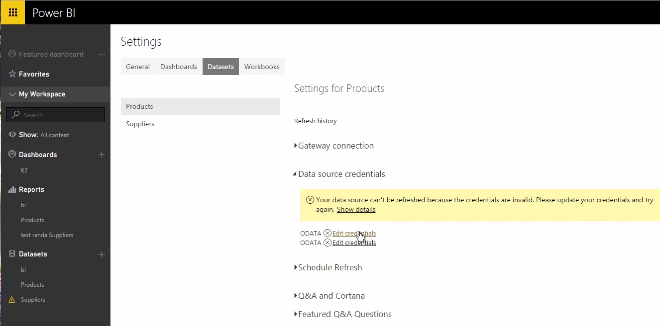 You must create the connection to the K2 SmartObject OData API in Power BI Desktop. Once the data is cached there, you can use the Power BI web and mobile interfaces to design reports. Configure the credentials for refreshing the data using Basic authentication as shown below: