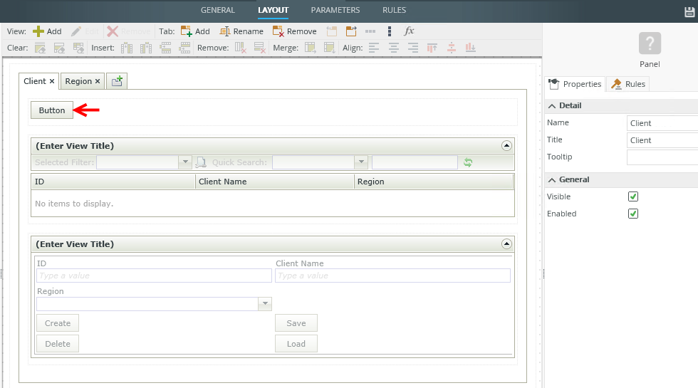 In this example we use a control on a form to open a tab on the same form. The canvas of the tab as shown in the image below is referred to as a panel in the Rule Designer. Follow the steps below to configure the rule: