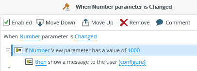 Add a parameter condition such as a View parameter has a specific value and action to the rule definition as required. One example is to show a message to the user if a view parameter is changed and has a specific value as shown below.