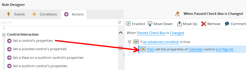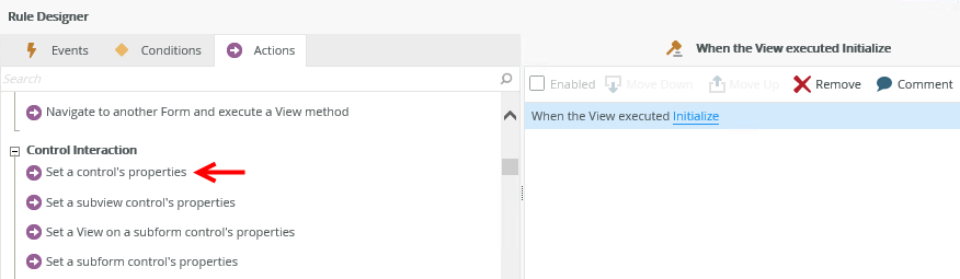 You can change the properties of a control at runtime when an event has executed. You can find these rule actions on a view and form in the Rule Designer.