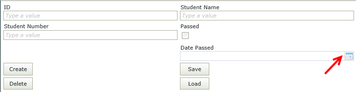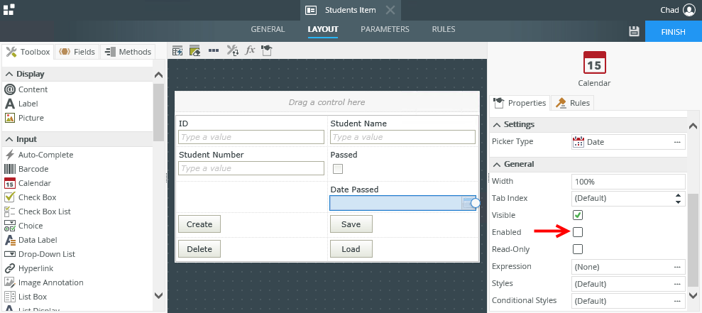 - Create a View that looks like the image below. Select the Calendar control, then deselect the Enabled property of the control. We want to enable the Calendar control at runtime if the Passed value is true. To do this, we disable the control and then create a rule to change the Calendar control to Enabled when the Passed value changes to true.