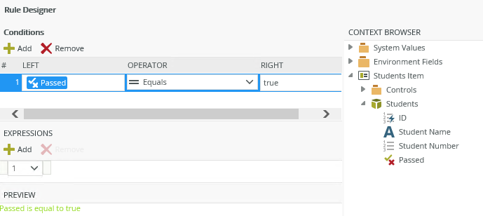 - Add an advanced condition to the rule to validate when the Passed value is true as shown below: