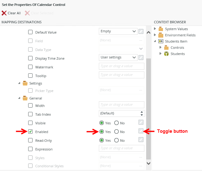 - Select Yes next to the Enabled property. Click the toggle button to change it to a field if you want to enter text or drag a field from the Context Browser to populate the property.