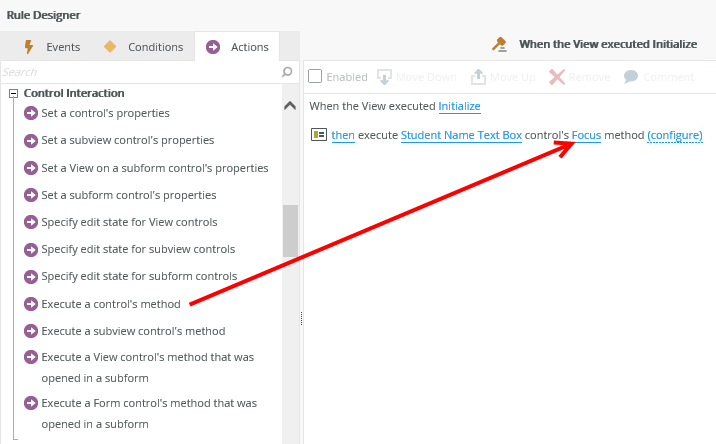 - When using the focus method, it is important to note that the control must be visible at runtime when executing the rule action.