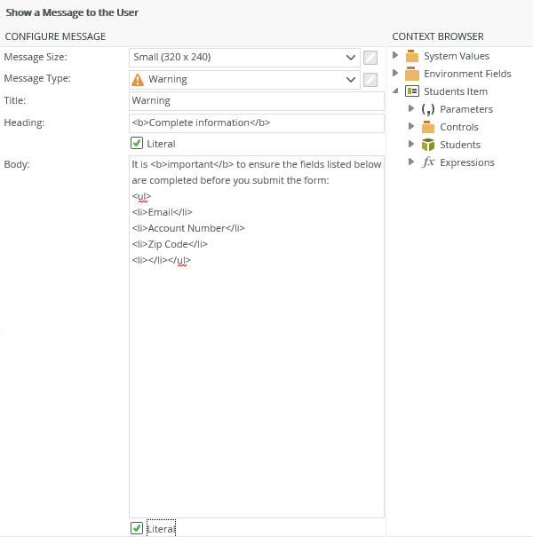 You can add HTML formatting to the heading of the message. To ensure the formatting displays correctly, mark the Literal check box. If the check box is not marked, the HTML formatting displays with HTML tags