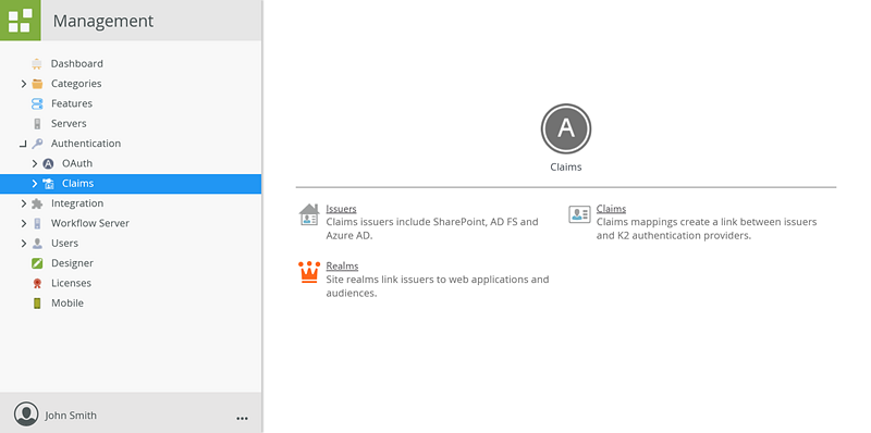 The Claims nodes in the Management Site is used to set up and maintain CBA configuration settings and allow you to add, edit or delete Resource Types, Resources, and Realms ,all of which work together to allow K2 to consume Claims as a Relying Party from a CBA-capable Identity Provider.