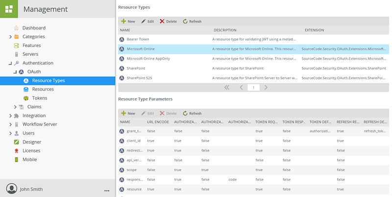 Field Description Name Provide a unique name for the OAuth Resource Type. The Name is usually the name of the service you wish to connect to (e.g. SalesForce or LinkedIn) since the parameters are usually specific to that service Description Provide a description for the OAuth Resource Type. Extension Extensions are used to handle any scenarios that are not covered by the OAuth2 specification. SharePoint, for example, uses a Server to Server token in on-premises installations that is not part of the OAuth2 specification. Refresh Token Expiration Days Indicates the number of days before the refresh token will expire. This varies from Resource to Resource and may not be applicable if the system supports rolling refreshes.