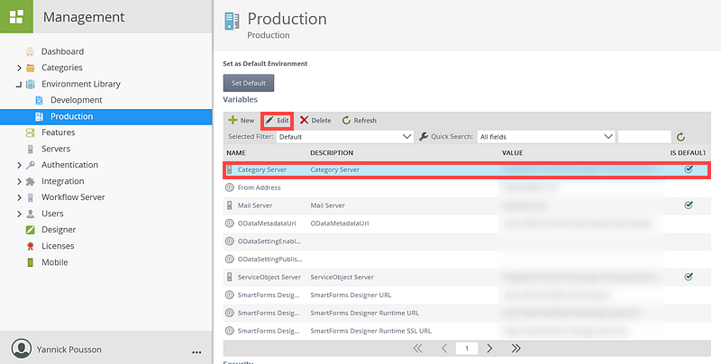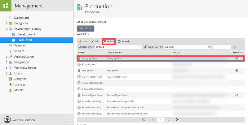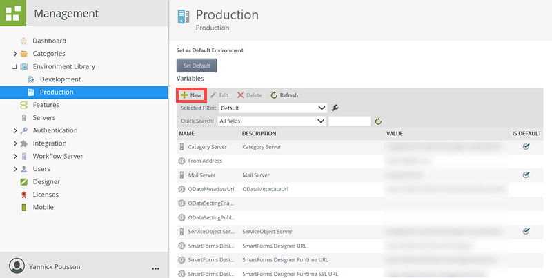 The Environment Library will contain nodes for each environment that has been defined in the current K2 environment, and from here you can configure the environment's variables and security.