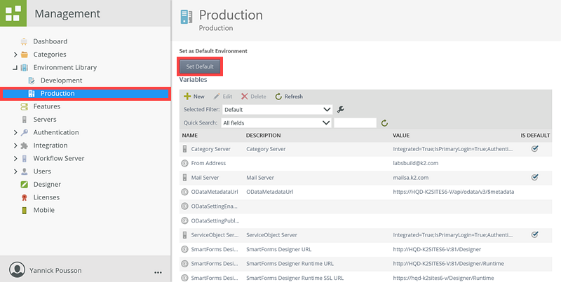 From time to time, you may need to manage the existing values or add new values in the Environment Library. By default K2 is installed with two Environments: Development and Production, but your environment may have additional or different environments registered.